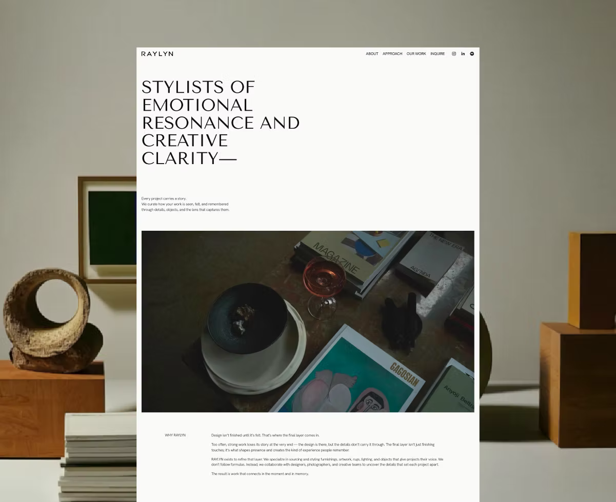 THE CLIENTRaylyn Creative House is an interior and lifestyle styling studio specializing in sourcing and styling for interiors, photography, and brand projects. With a belief that design isn’t finished until it’s felt, Raylyn brings the final layer that transforms a space or visual into an experience. They needed a brand identity and website that were contemporary, understated, and refined; a true reflection of their vision and values.